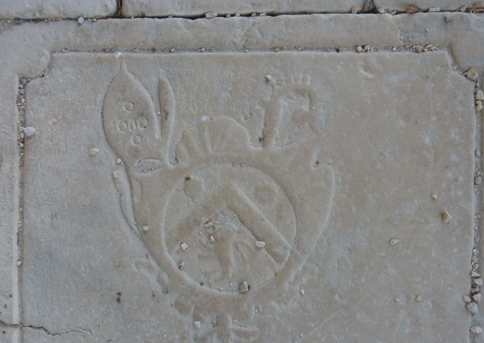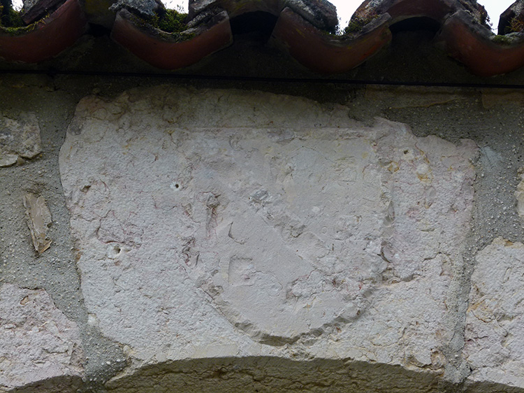 Cet écu est sculpté sur une pierre tombale. D'après la tradition il s'agirait de celle d'un abbé de l'abbaye de Saint Sulpice. d'azur à un chevron de... à deux étoiles de .... en chef accompagné d'un .... de .... en pointe. Une couronne de marquis, une mitre et une crosse, les deux derniers sont les symboles des abbés. |