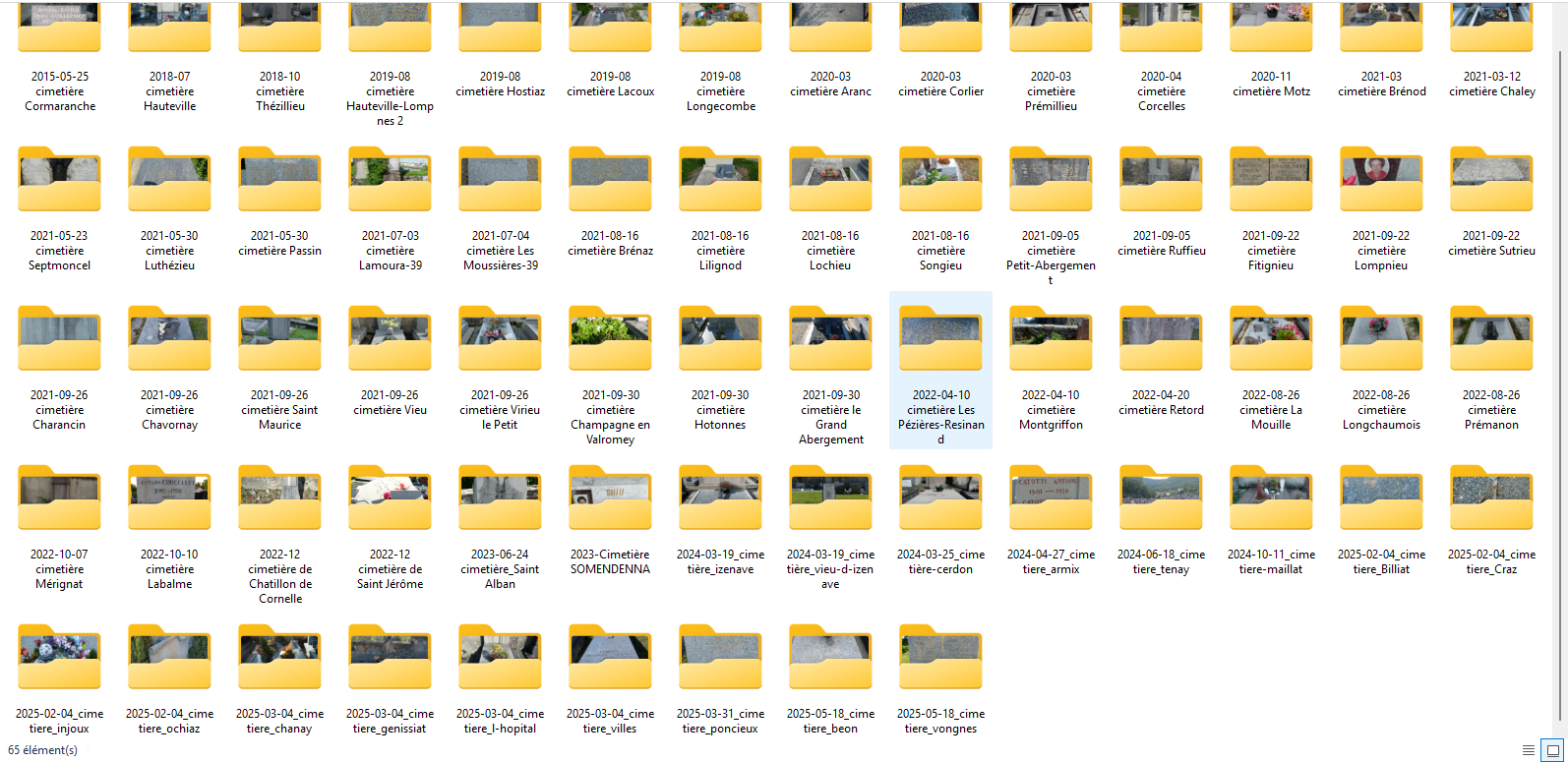 Je me suis consacré depuis quelques années à la sauvegarde des cimetières du Bugey, en débordant quelques fois comme le Jura pays des ancêtres de mon grand-père ! Le plateau d'Hauteville et le Valromey sont terminés (Champdor a été réalisé par Mme ZELINDRE). En avril 2022 j'ai mis en ligne Montgriffon, Les Pézières et le cimetière du plateau de Retord ; en octobre 2022 Labalme, Mérignat.... En décembre ce sont Châtillon de Corneille et Boyeux saint Jérôme ; en juin j'ai couvert le cimetière de Saint Alban. Puis en 2024 j'ai photographié ceux de la combe du Val et celui de Cerdon. Le dernier mis en ligne est celui d'Armix.