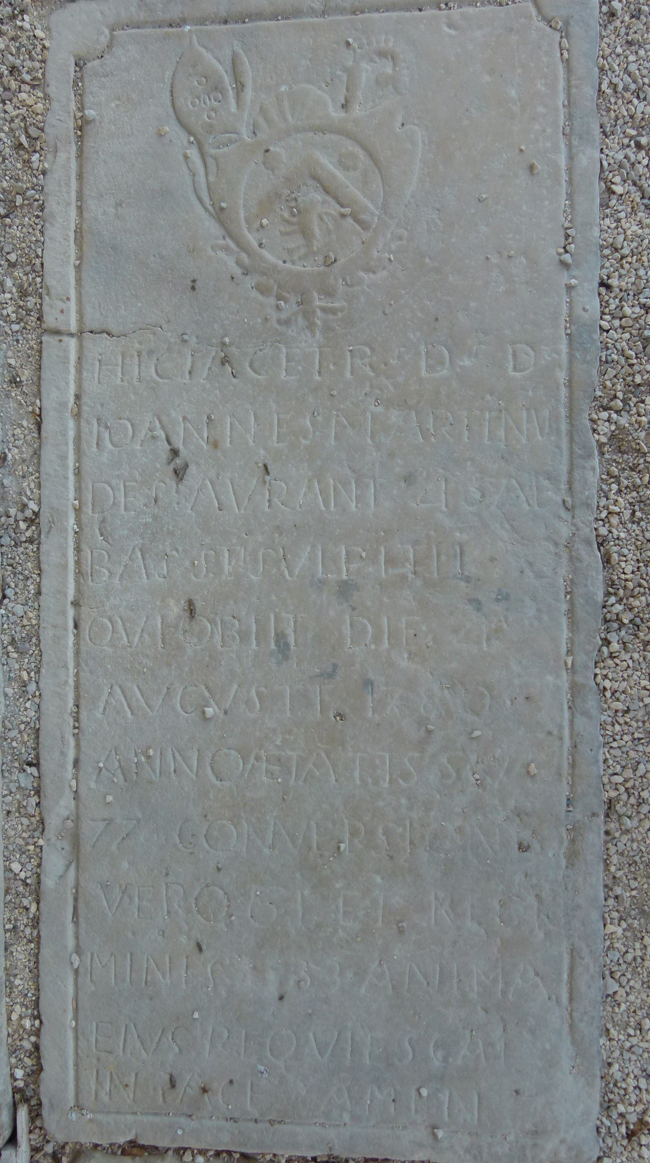 Le déchiffrage n'est pas aisé. HIC JACET D - D JOANNES MARTINUS DE St AURANT 46 AB BAS St SULPITII OBEIT DIE 4 AVOUST 1780 ANNOAETATTS S?? 77 CONVERSIONS VEROGI ET RI?? MINIS 33 ANIMA EJUS REOVIES CA? IN PACE AMEN Ici git |
