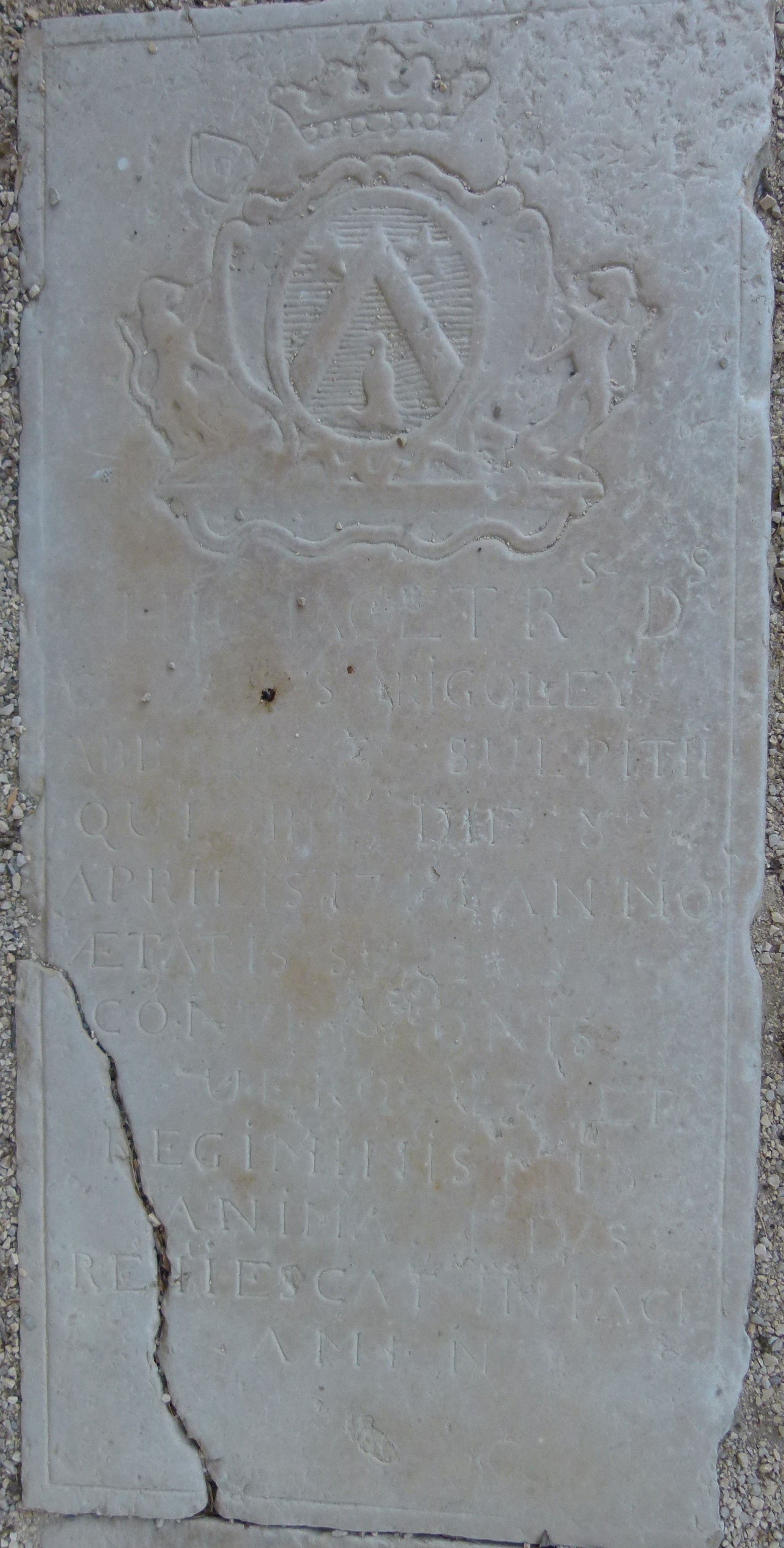 HIC JACET Rs Ds F D RIGOLEY ABBE DE St SULPITII QUE ?? DIE 8 APRILIS 17?? ANNO CONVERSIONIS VERO ?? ?? ANIMA ? ? RENIESCAT IN PACE AMEN ici repose Révérendissime |