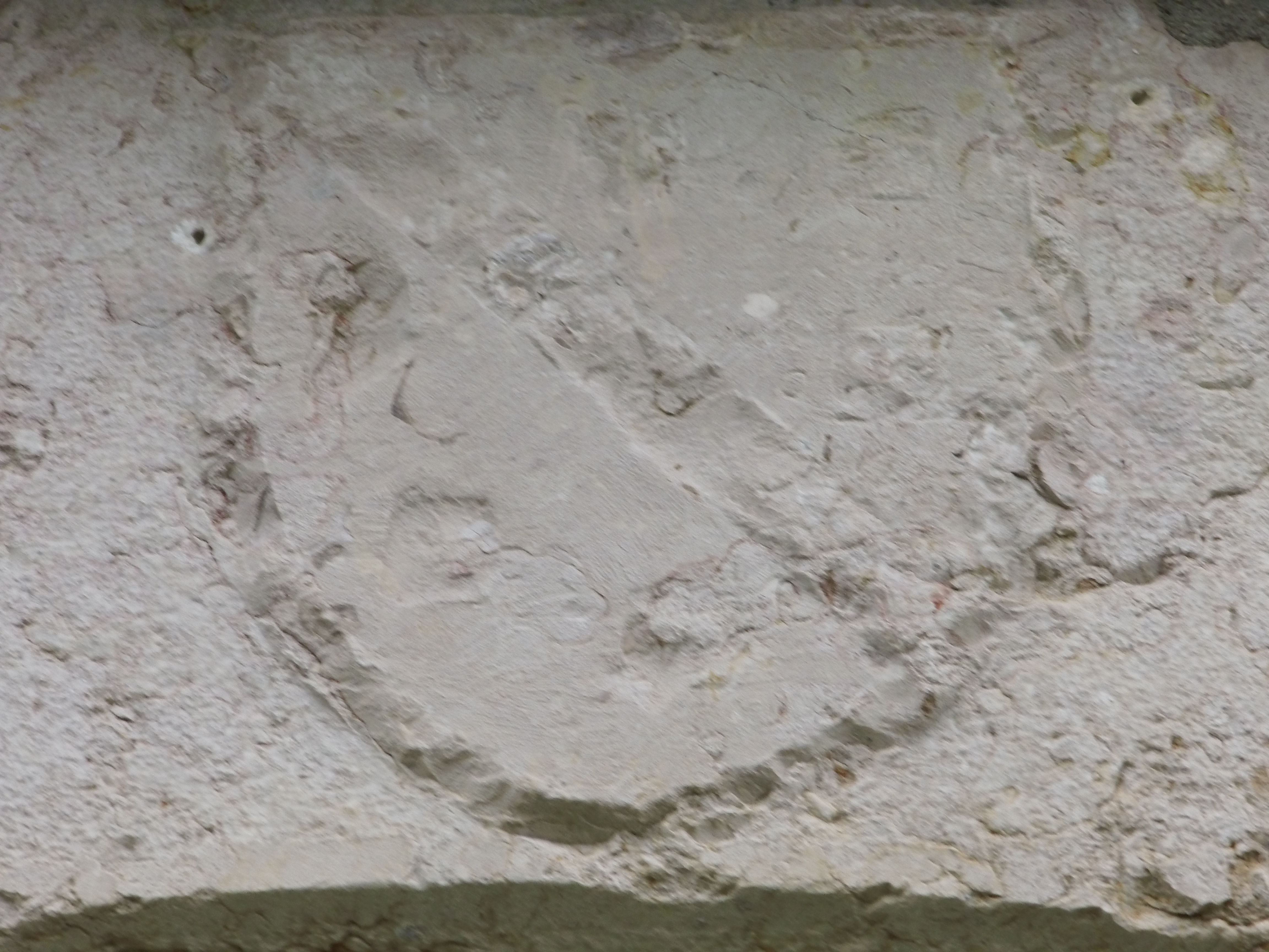 Cet autre écu en clé de voute, n'est pas identifié à ce jour. Ecartelé au 1 et 4 de .... ; au 2 et 3 écartelé d'argent et d'azur. Le 2 et 3 pourrait être la famille de BUSSY, possessionnée dans l'Ain à Apremont, Boches, Martignat.... |