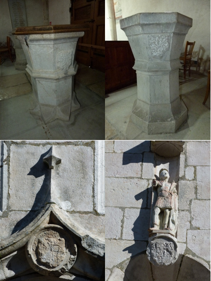 Les armoiries de la famille de MONTFALCON est partout ! En façade, sous les statues, en décoration, sur les fonds baptismaux, etc... |