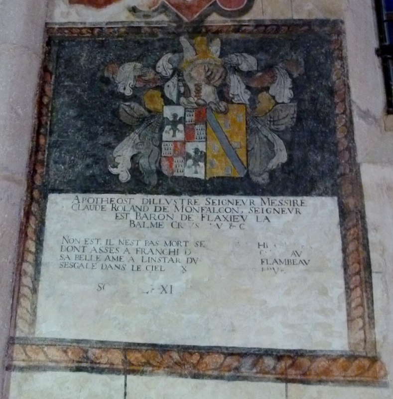 Cet écu est composé des armoiries de MONTFALCON accompagnée de celle de son épouse de MOYRIA. Claude Roland de MONTFALCON porte : écartelé, aux 1 et 4 d'argent à une aigle éployée de sable, membrée et becquetée d'or ; au 2 et 3 écartelé d'hermine et de gueules. Jeanne de MOYRIA porte : d'or à la bande d'azur accompagnée de six billettes du même rangées en orle. Le seigneur de Flaxieu est enseveli dans l'église. Son épouse Jeanne baronne de Flaxieu décède le 22 septembre 1641. |